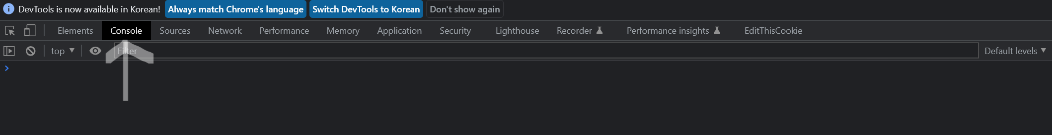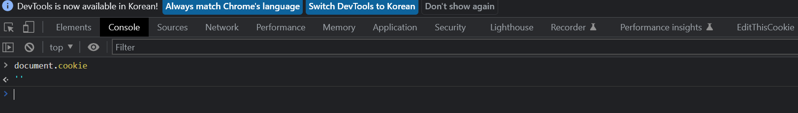 2. Console ํญ ํด๋ฆญ ํ document.cookie ์ ๋ ฅ