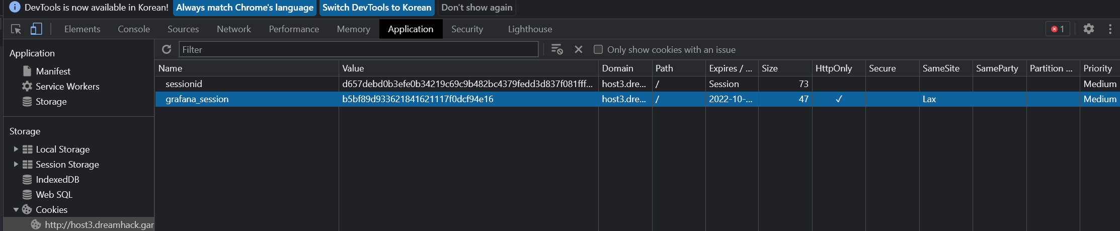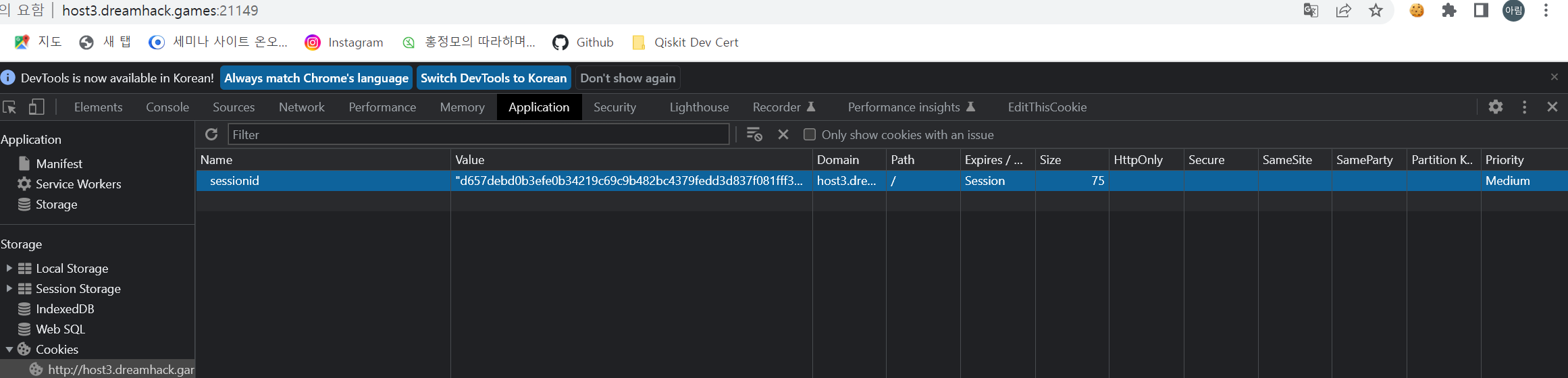 6. ๋ ธ์ถ๋ admin์ ์ธ์ ์์ด๋ ๋ณต์ฌ ํ F12๋ฅผ ๋๋ฌ ๊ฐ๋ฐ์ ๋๊ตฌ ์คํ --> Application์ Cookies ํญ์ผ๋ก ์ด๋