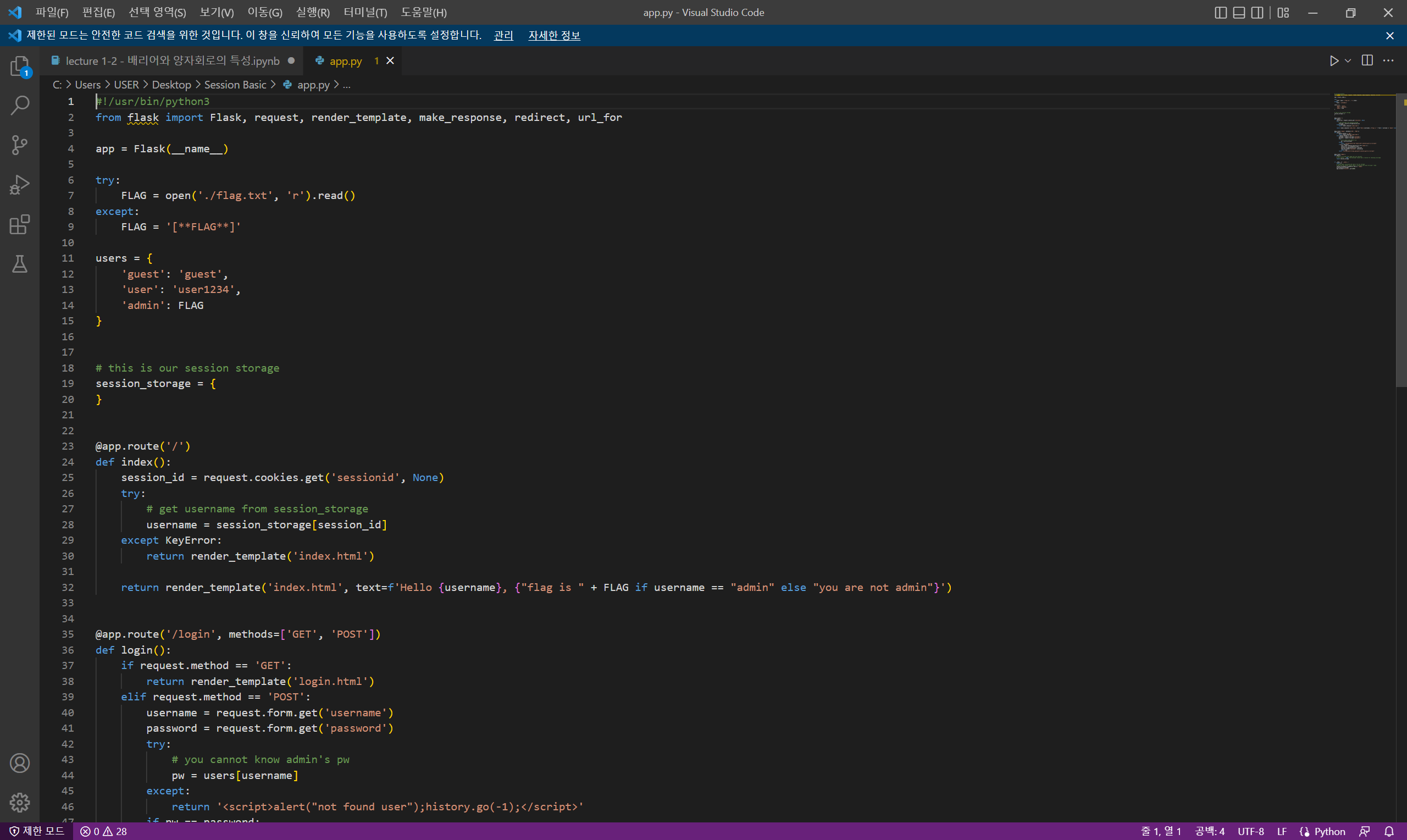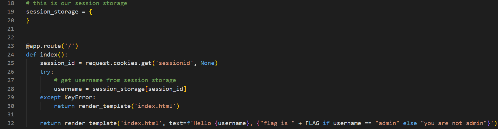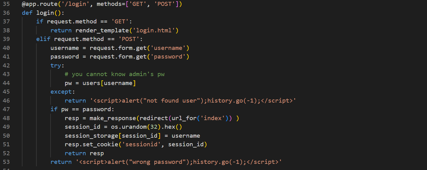 : ๋ง์ผ ๋ก๊ทธ์ธํ ์์ด๋๊ฐ admin์ด ์๋๋ผ๋ฉด 'you are not admin'์, ๋ง๋ค๋ฉด FLAG๋ฅผ ์ถ๋ ฅ