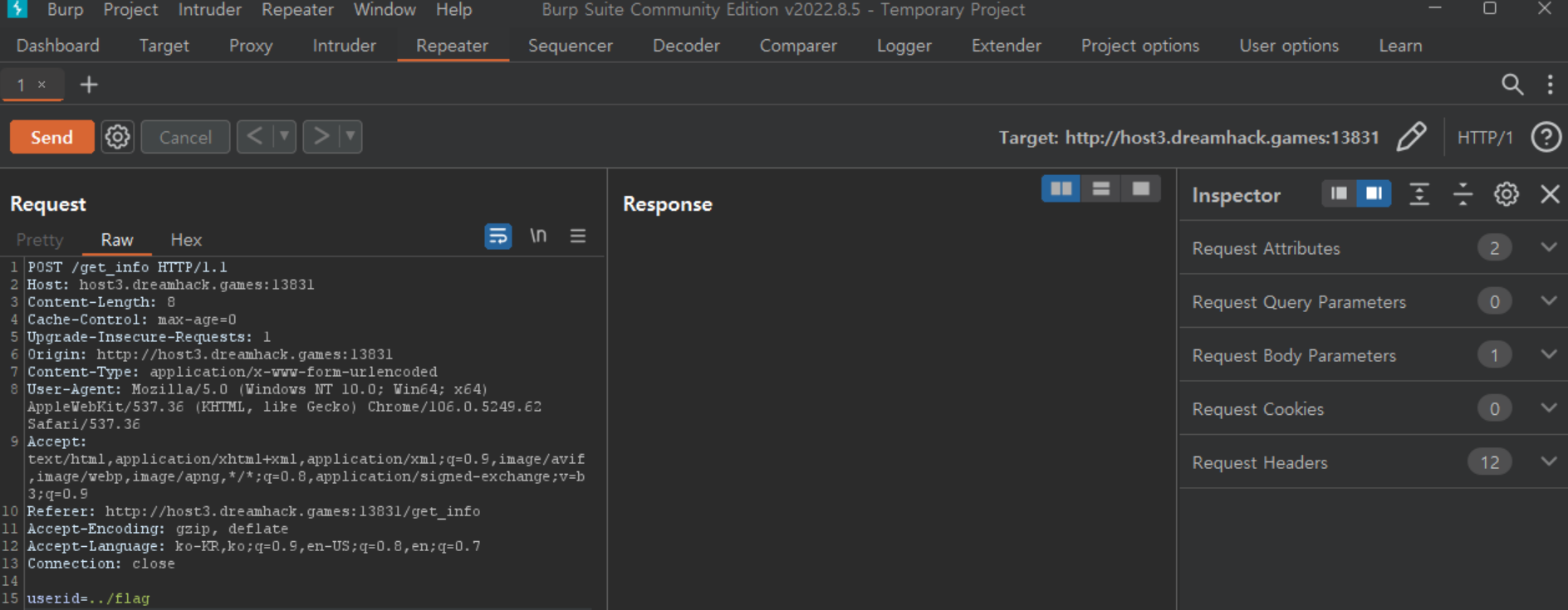 6. ๋ฒํ์ค์ํธ์ Proxy ํญ์์ ํจํท์ ๊ฐ๋ก์ฑ Repeater๋ก ์ ์ก ํ userid๋ฅผ ../flag ๋ก ์์