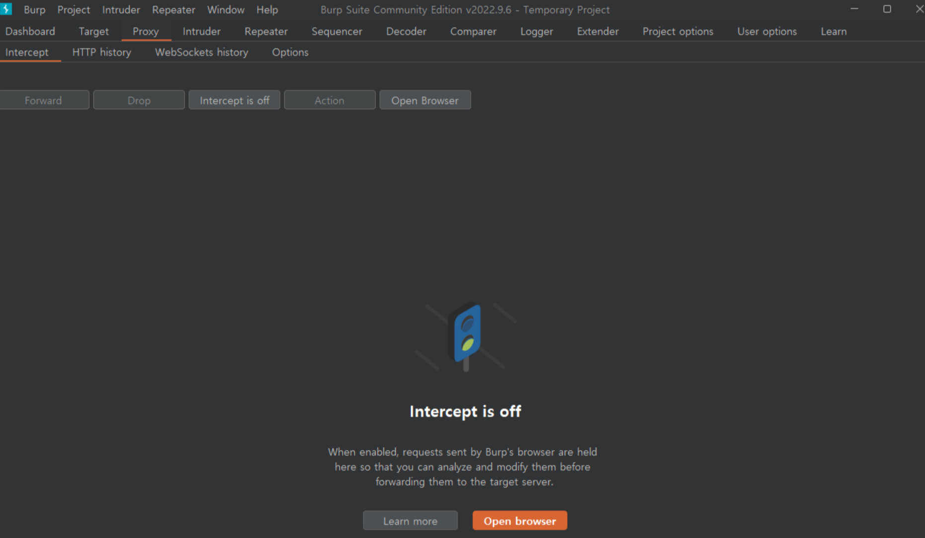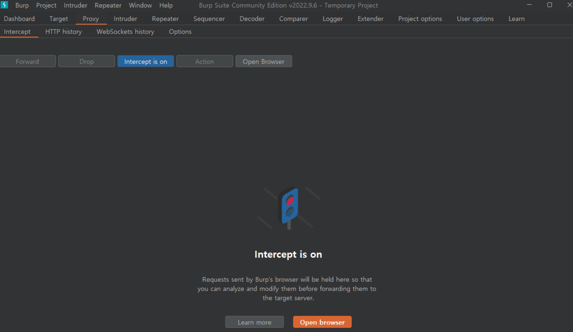 4. ๋ค์ Proxy ํญ์ Intercept๋์ผ๋ก ์ด๋ํ์ฌ ์ธํฐ์ ํธ ์ค์ ์ on์ผ๋ก ๋ฐ๊ฟ์ค๋ค.