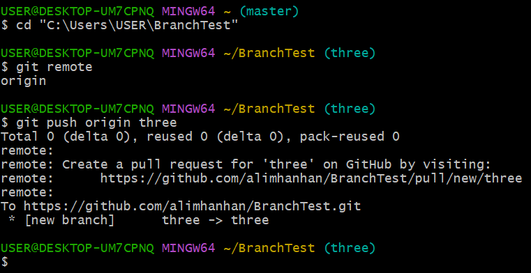 $ git push origin "๋ฐ์ํ ์ฌํญ" #3 ํ์๋ ๋ณ๋์ ๋ฐ์ ์ฌํญ ์์ด branch three๋ง ์ถ๊ฐ