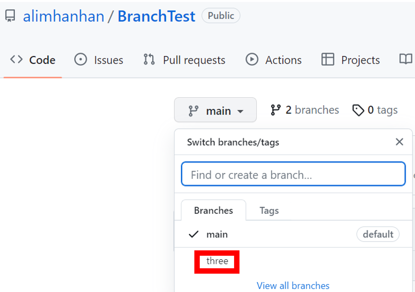3. ๋ค์ GitHub ๋ ํฌ์งํ ๋ฆฌ์ ๋ค์ด๊ฐ branch๋ฅผ ํ์ธํด๋ณด๋ฉด, ์ ์์ ์ผ๋ก 'three' ๊ฐ ์ถ๊ฐ๋์์์ ํ์ธํ ์ ์๋ค.