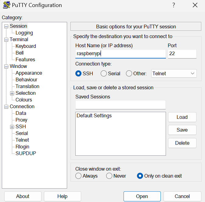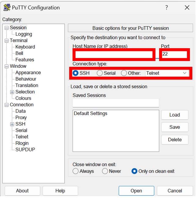 5. PuTTY ์คํ ํ ํธ์คํธ๋ช , ํฌํธ๋ฒํธ, ์ฐ๊ฒฐ ํ์ ์ค์ --> Open ํด๋ฆญ