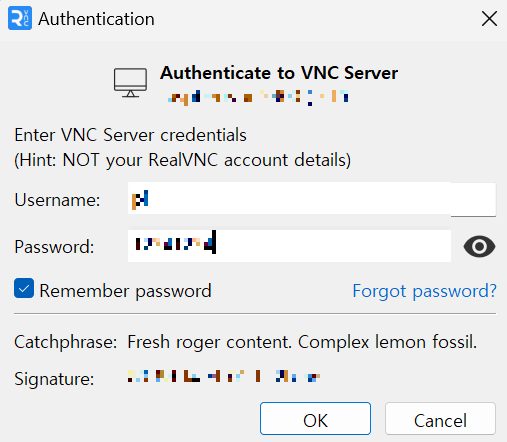 17. VNC Viewer ์คํ ํ ์ฌ์ฉ์๋ช ๊ณผ ํจ์ค์๋ ์ค์ --> "OK" ํด๋ฆญ