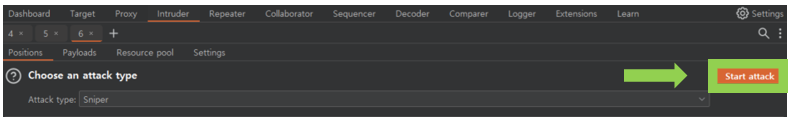 8. ์๋จ์ Intruder ํญ์ผ๋ก ์ด๋ ํ, Positions & Payloads ๋ฅผ ์๋์ ๊ฐ์ด ์ค์