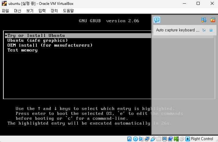2. ํ์ดํ ํค๋ก "Try or Install Ubuntu" ์ ํ ํ Enter ํด๋ฆญ
