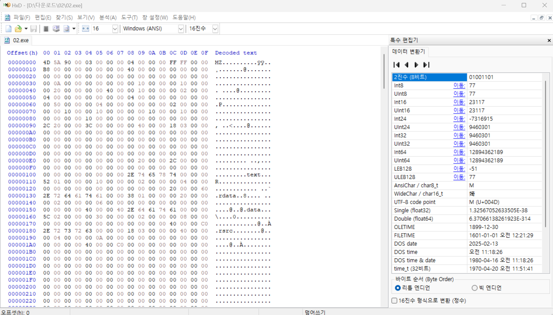 4. HxD ์คํ ํ 02 ํ์ผ ์คํ --> ํ์ผ์ด ์ฑ๊ณต์ ์ผ๋ก ์ด๋ฆฌ๋ ๊ฒ์ ํ์ธ