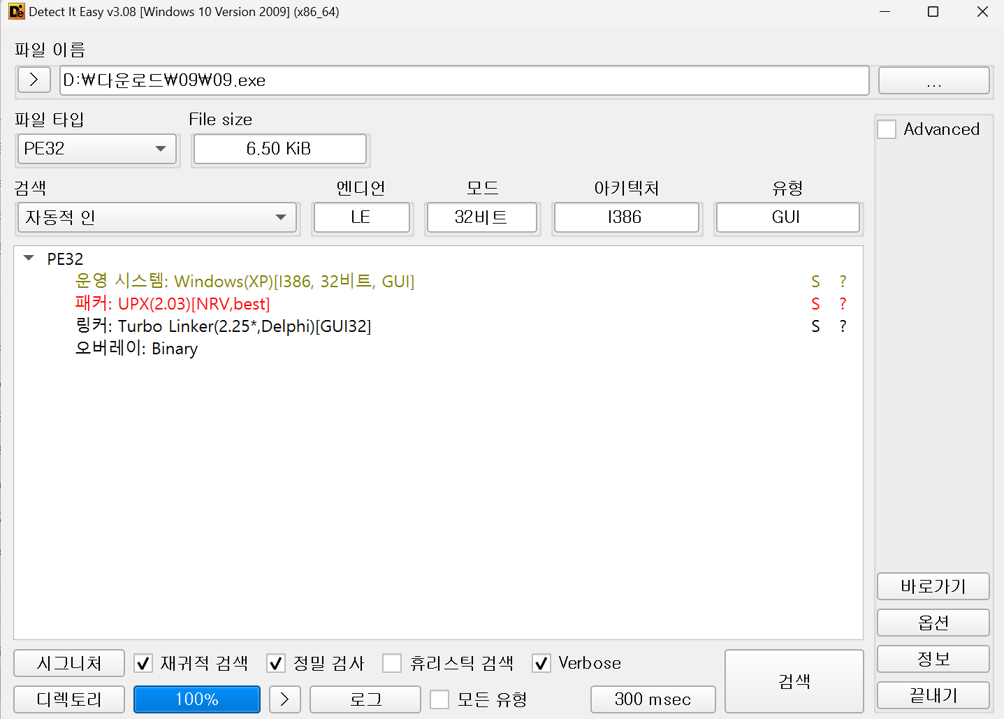 3. ๊ด๋ จ ์ ๋ณด ์์ง์ ์ํด Detect It Easy ๋ฅผ ํตํด ํ์ผ ์คํ --> ํ์ผ์ด UPX ํ์์ผ๋ก ํจํน๋์ด์์์ ํ์ธ