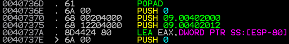 6. ์ธํจํน๋ ํ์ผ(09_unpacked.exe)์ Immunity Debugger์์ ์คํ --> MessageBox() ํจ์์ ์ธ์๊ฐ ๋ถ๋ถ์ด ๋น์ด์์์ ํ์ธ