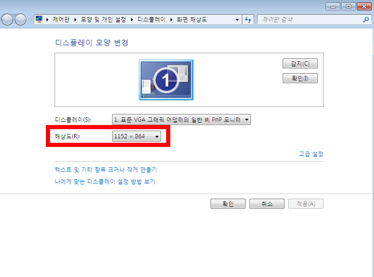 5. ํ๋ฉด ํด์๋ ๋ณ๊ฒฝ ์ฌ๋ถ ์ฒดํฌ ํ 'ํ์ธ' ๋ฒํผ ํด๋ฆญ --> ํ๋ฉด ํฌ๊ธฐ๊ฐ ์ฑ๊ณต์ ์ผ๋ก ๋ณ๊ฒฝ๋์์์ ํ์ธ