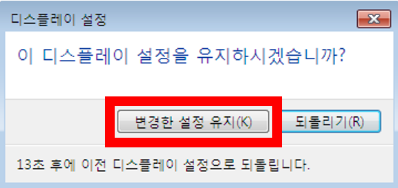 4. ํ๋ฉด ํด์๋ ๋ณ๊ฒฝ ํ 'ํ์ธ' ๋ฒํผ ํด๋ฆญ --> '๋ณ๊ฒฝํ ์ค์ ์ ์ง(K)' ์ ํ