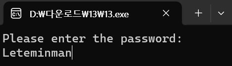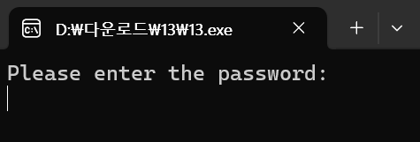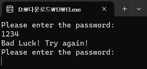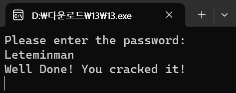 9. ๋ค์ 13.exe ํ์ผ ์คํ ํ ๋ฐ๊ฒฌํ ํจ์ค์๋ ์ ๋ ฅ --> ๋ฌธ์ ๊ฐ ์ฑ๊ณต์ ์ผ๋ก ํด๊ฒฐ๋์์์ ํ์ธ