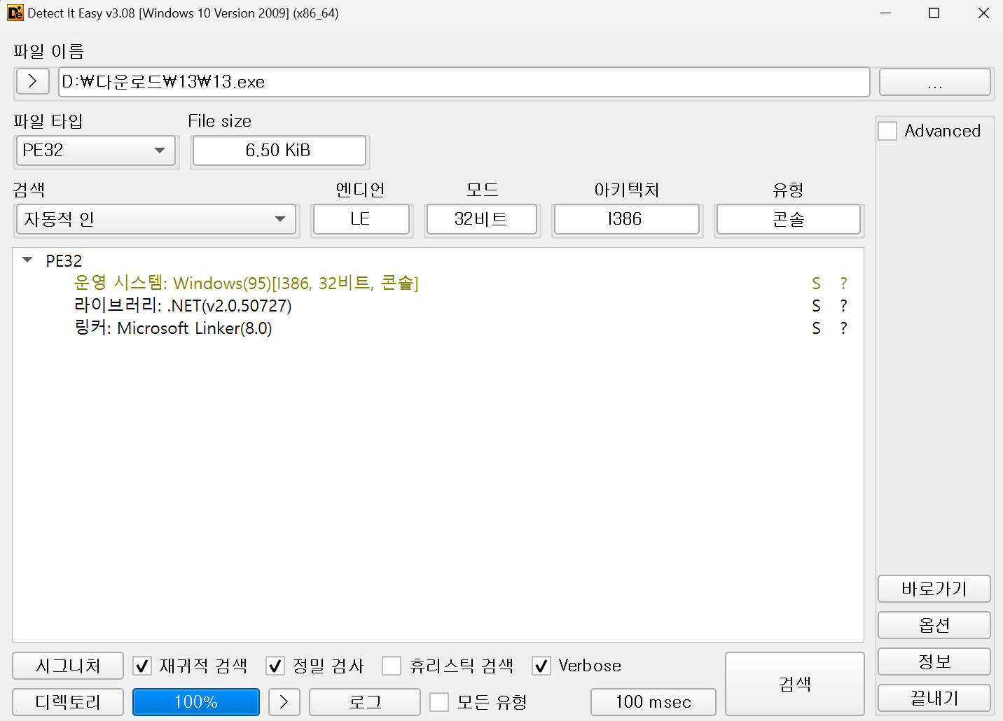 4. ๊ด๋ จ ์ ๋ณด ์์ง์ ์ํด Detect It Easy ๋ฅผ ํตํด ํ์ผ ์คํ --> ํ์ผ์ด .NET ํ์์์ ํ์ธ
