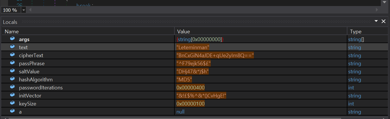 คtext = RijndaelSimple.Decrypt(cipherText, passPhrase, saltValue, hashAlgorithm, passwordIterations, initVector, keySize);