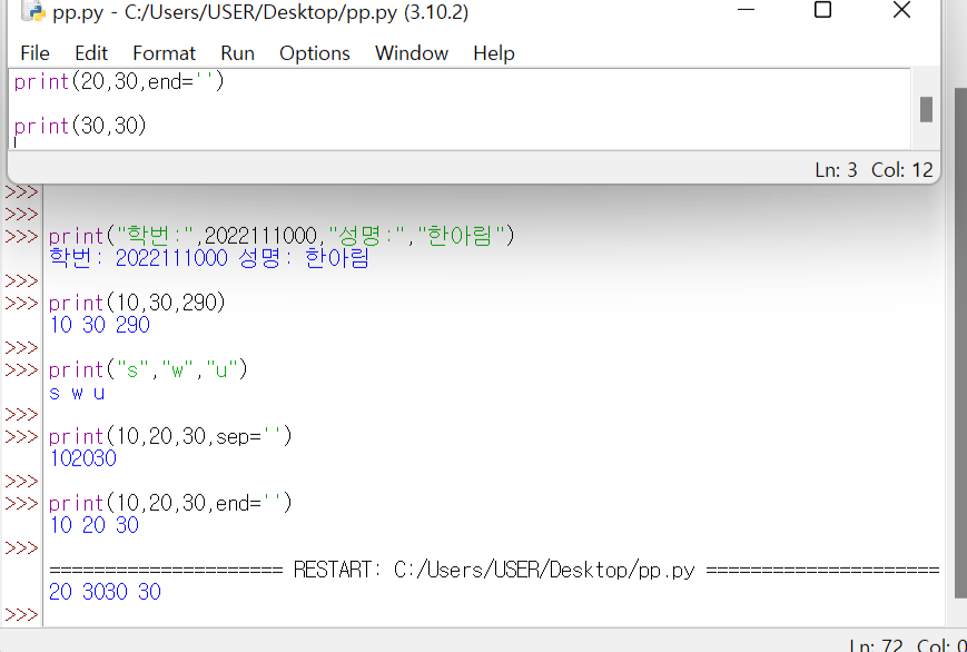 - end = ๋ฅผ ๊ฑด๋๋ฆฌ๋ฉด ์ค๋ฐ๊ฟ์, sep = ์ ๊ฑด๋๋ฆฌ๋ฉด ๋์ด์ฐ๊ธฐ ์ ๋๋ฅผ ์กฐ์ ํ ์ ์๋ค.