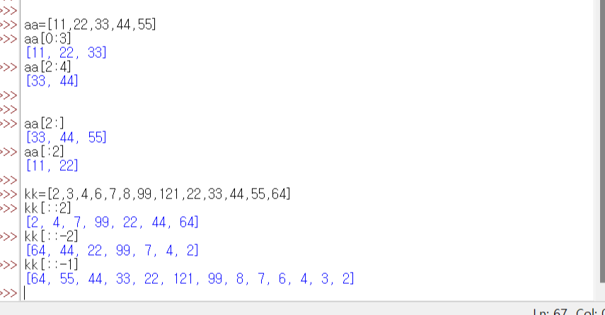 : ๋ฆฌ์คํธ ์ด๋ฆ[ ์ฒจ์ : ] -> ๋ฆฌ์คํธ ์ด๋ฆ[ ์ฒจ์ ]๋ถํฐ ๋๊น์ง์ ๊ฐ