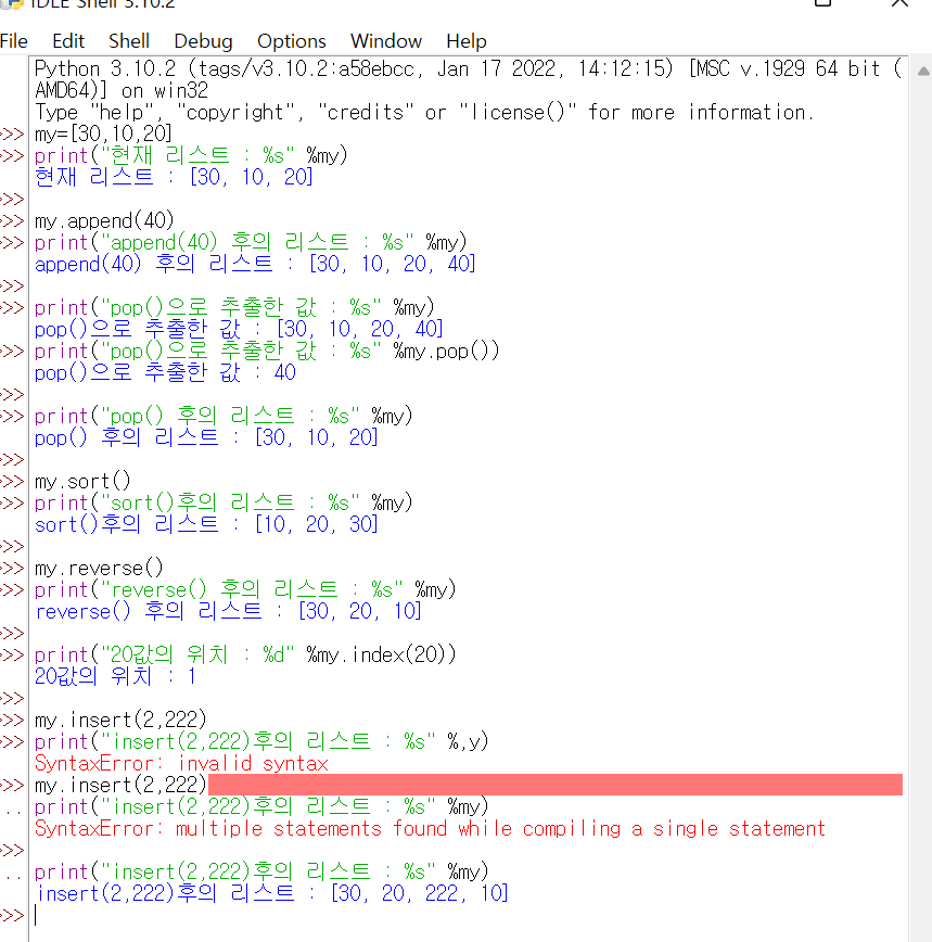 : ๋ฆฌ์คํธ๋ช .insert( ๊ฐ ) -> ์ง์ ๋ ์์น์ ๊ฐ ์ฝ์