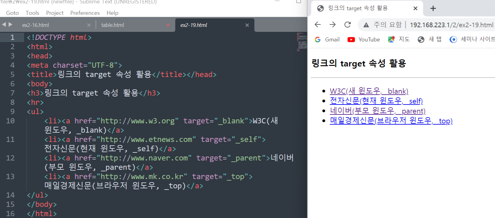- target : ๋งํฌ์ ์ฐ๊ฒฐ๋ HTML ํ์ด์ง๊ฐ ์ถ๋ ฅ๋ ์๋์ฐ ์ด๋ฆ ์ง์